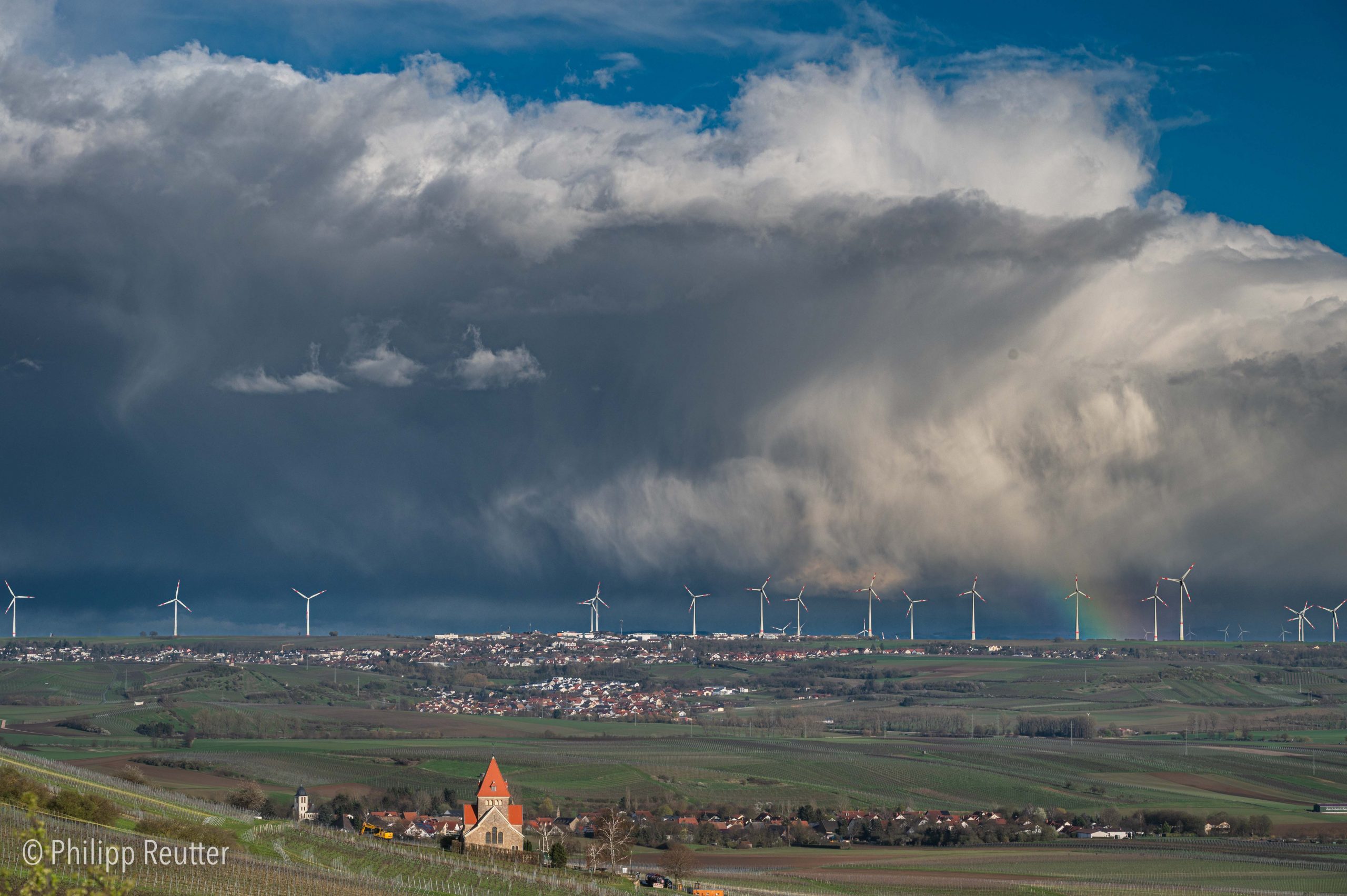 Gewitter über Rheinhessen, im Vordergrund die Kreuzkapelle von Gau-Bickelheim.