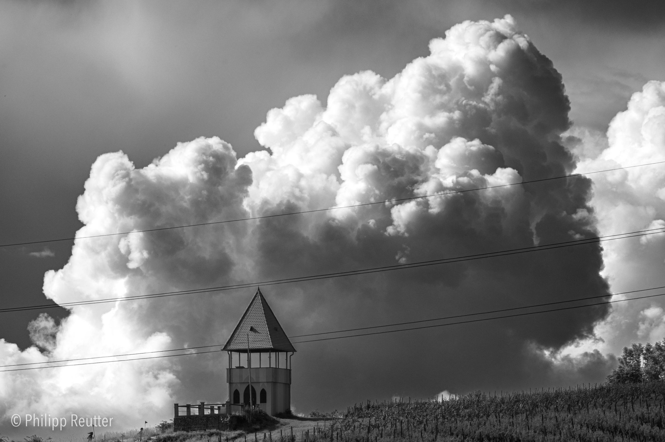 Eine mächtiger Cumulus congestus, die Vorstufe eines Gewitters, baut sich hinter dem Schildbergturm in Sulzheim auf.
