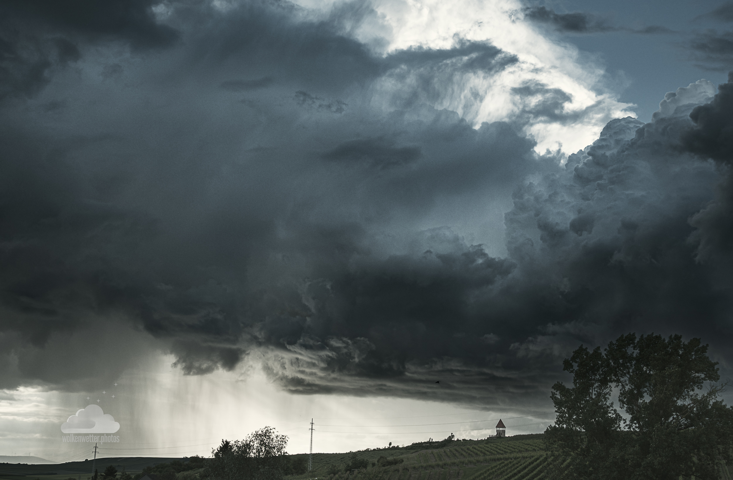 Ein Gewitter lässt seine nasse Ladung über Sulzheim (Rheinhessen) ab.